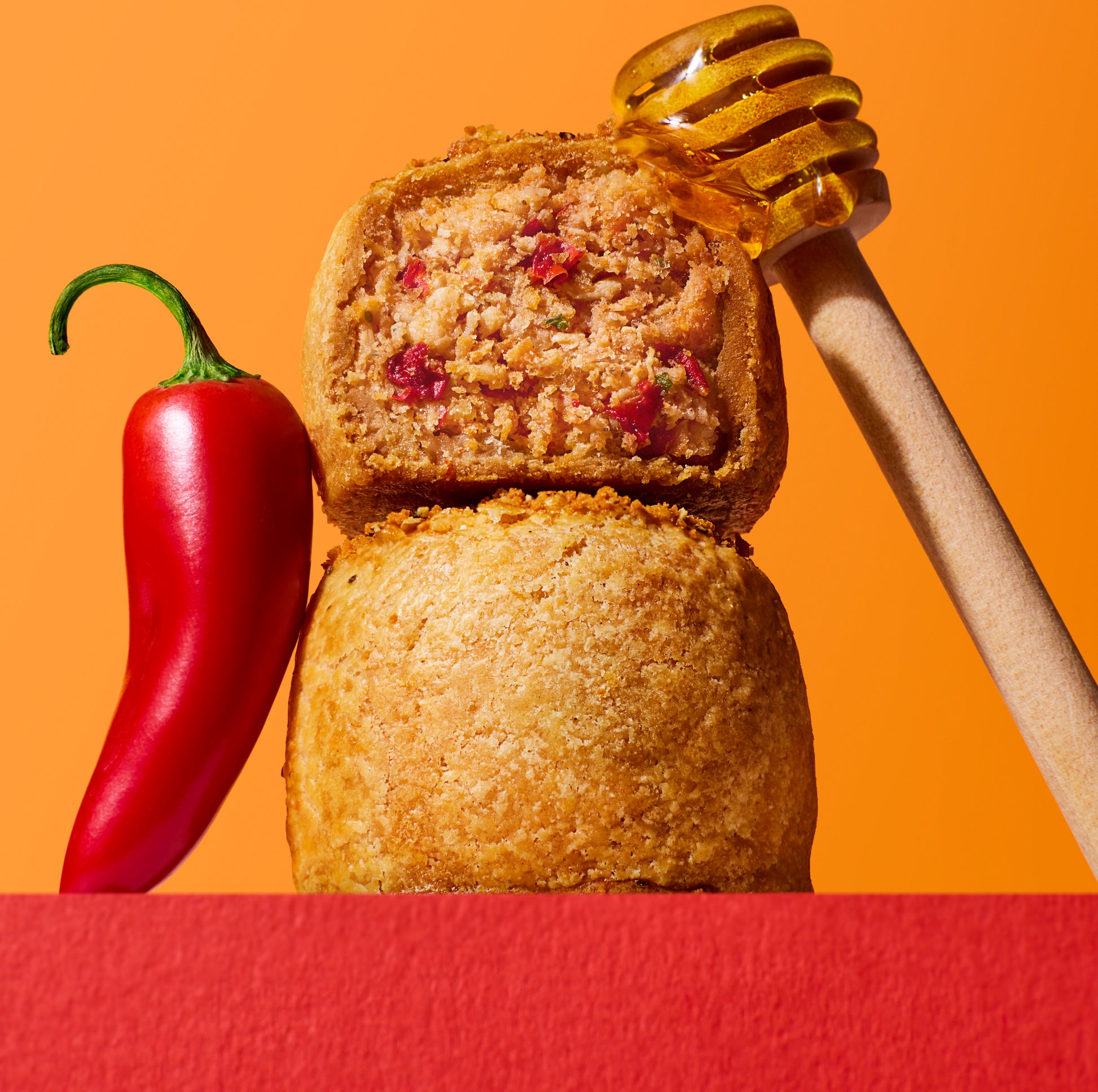 Wheat Flour (Wheat Flour, Calcium, Folic acid, Iron, Niacin, Thiamin), Pork (13%), Pork Lard, Chicken (11%), Water, Pork Fat, Red Pepper, Hot Honey Sauce (3%) (Sugar, Honey, White Wine Vinegar, Tomato Paste, Dextrose, Glucose Syrup, Water, Garlic Powder, Cornflour, Chilli, Cayenne Chilli, Salt, Acidity Regulator (Acetic acid), Colour (Paprika extract)), Honey, Palm Oil, Rapeseed Oil, Onion, Potato Starch, Pork Extract, Salt, Red Chilli, Smoked Paprika, Pork Gelatine, Black Pepper, Pasteurised Liquid Egg, Wheat Gluten, Parsley, Cayenne Pepper, Colour (Paprika extract), Preservative (Sodium nitrite), Yeast.